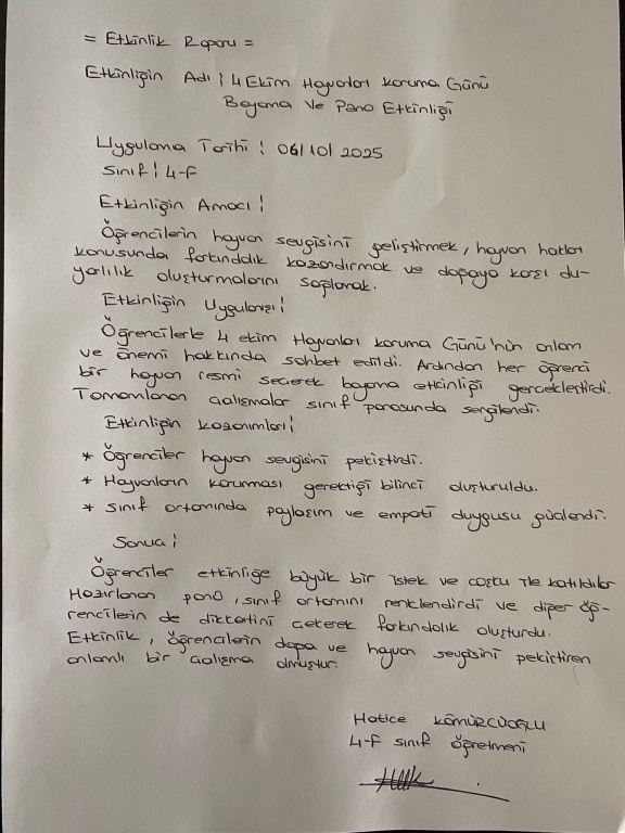 BİGEP kapsamında 06.10.2025 tarihinde 4/F sınıfı öğrencileriyle “4 Ekim Hayvanları Koruma Günü” etkinliği gerçekleştirildi.